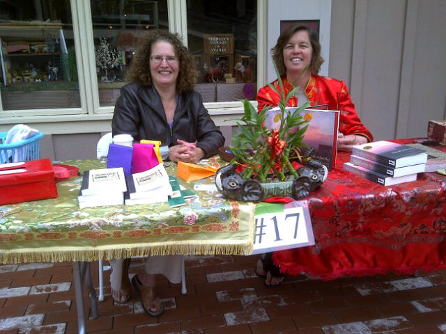 Here’s a picture of me and Jana McBurney-Lin, one of my critique partners and the author of My Half of the Sky. Jana’s wonderful novel is set in China, about a modern young woman struggling to hold up her half of the sky, despite the pushes and pulls of her traditional village. I think the gorgeous Chinese cloths she brought really made our table call out to people.